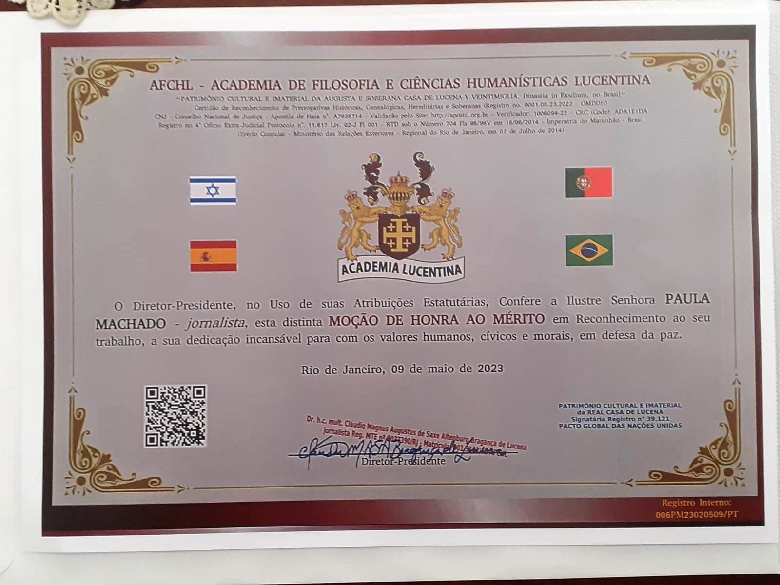 É uma menção honrosa ao Mérito da Academia de Filosofia e Ciências Humanísticas Lucentina da América do Sul. Esta academia é património imaterial da Real Casa de Lucena e integra o Pacto Global das Nações Unidas.
